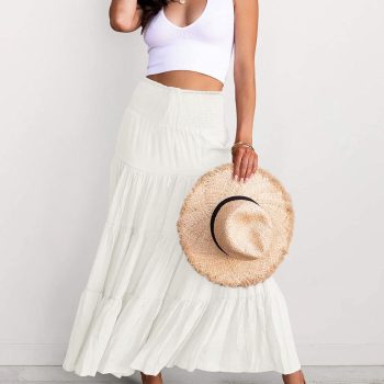 Maxi Skirt for Women Summer Boho Elastic High Waist Pleated A-Line Flowy Ruffle Swing Tiered Long Beach Skirt Dress