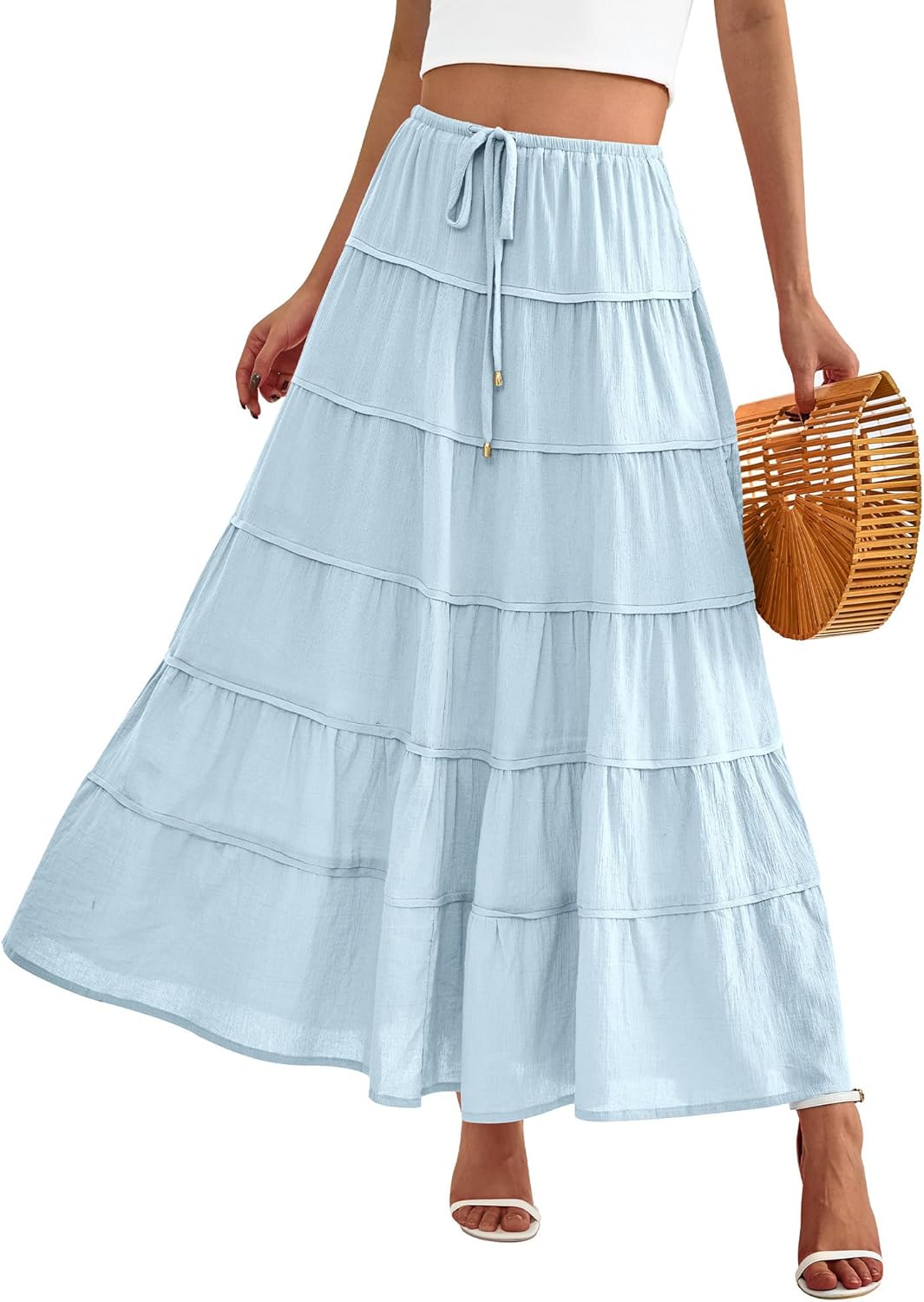 - FEATURES: S=US 4-6, M=US 8-10, L=US 12-14, XL=US16 / Skirts For Women / Elastic Mid-Waist With Drawstring / Tiered Design / Pleated Detailing / Side Pockets / Cotton Textured Material / Soft & Lightweight / Flowy A-Line Shape / Half Lining / Maxi Length